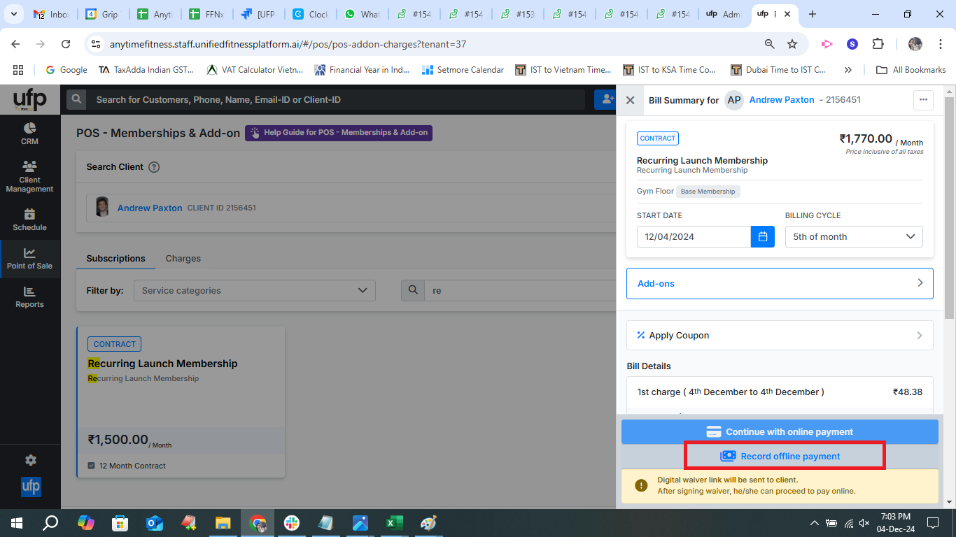 AF Corporate Arpit has shared a feedback and request for the Offline Payment to be disabled at the time of Recurring Membership signup billing, as soon as the contract/payasyougo membership type is added at the time of Signup billing, then the Record Offline Payment should get disabled. Image of the same below